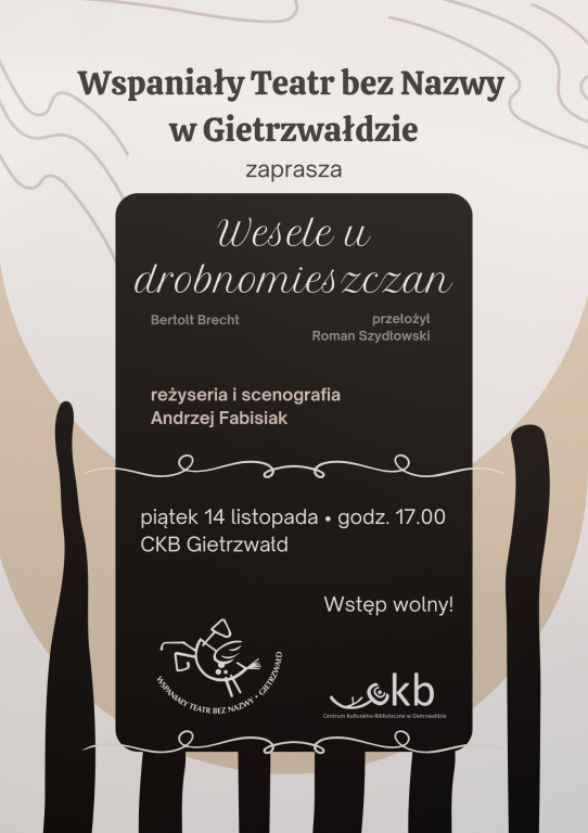 W piątek 14 listopada o godzinie 17.00, w Centrum Kulturalno-Bibliotecznym w Gietrzwałdzie odbędzie się przedstawienie „Wesele u drobnomieszczan" Wspaniałego Teatru bez Nazwy.